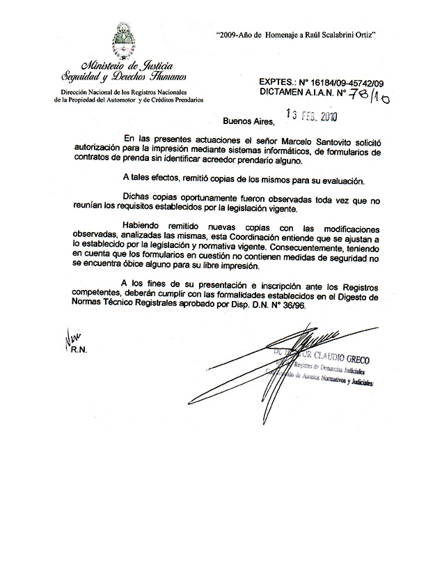 Autorización de uso e impresión de modelo de contrato prendario genérico, creado por ei-forms, por parte de la D. N. R. P. A. y C. P. Dictamen A. I. A. N. Nº: 78/10