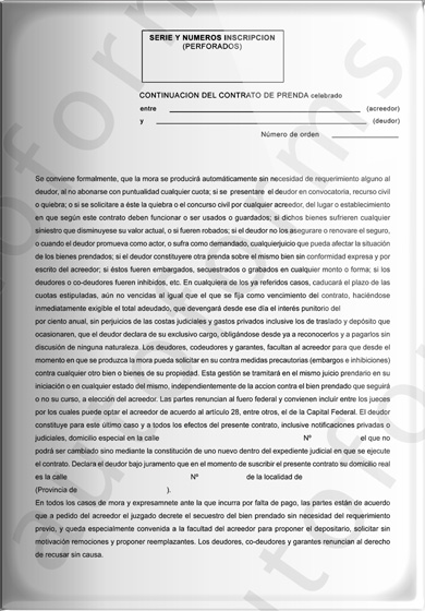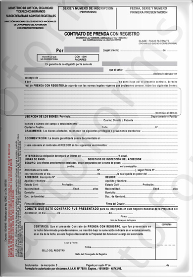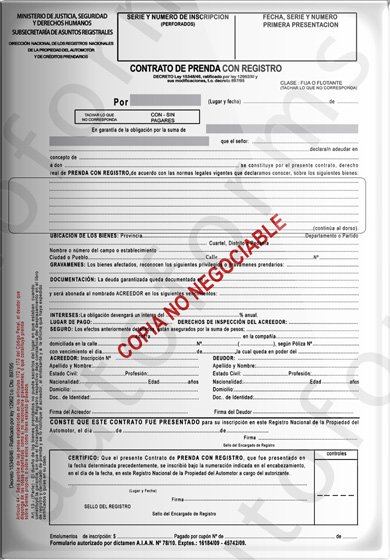 A continuación damos a conocer la autorización de la D. N. R. P. A. y C .P. que nos permite la utilización e impresión de contratos de prenda sin identificar acreedor prendario alguno. El mencionado contrato (incluye copias no negociables y continuaciones) puede ser impreso, con el sistema Autoforms, junto con los datos correspondientes o bien ser impreso en blanco para completar mas tarde.
