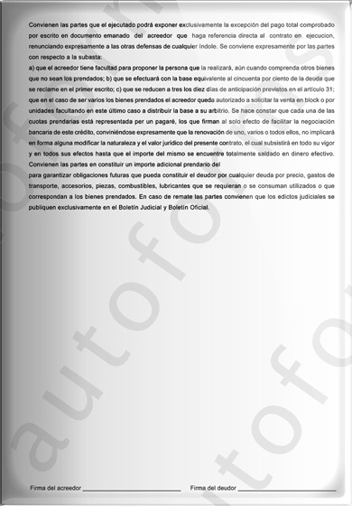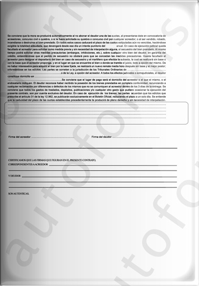 Vale aclarar que a la imagen que está observando se le ha incorporado una MARCA DE AGUA, es decir una leyenda transversal que dice AUTOFORMS. La misma se utiliza para proteger el contrato y hacer valer nuestra propiedad intelectual. Cuando el usuario utiliza nuestro sistema e imprime el contrato prendario, dicha marca desaparece.